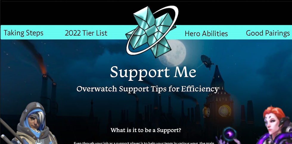 Website visual practice on a site a "how-to" based website. I based my design and information off Overwatch and how to play support. Overwatch is an extensive game that has many factors. So many to the point that it may be difficult for someone new to get into the game, or even focus on a specific role. There are four roles to think about; Damage which extends out to offensive and defensive, tank, and support. Supports are critical in any multiplayer game no matter the type, they help keep everyone alive and also can be a great counter to make space. The main focus is easy access to base tips and information, for it took several sources to find everything that would be useful when introducing a player to a new role or continuing to practice a role. Both this site and booklet will focus on the support role, the characters, good combos, and much more to help someone jump into the game with new knowledge, or be used as a guide to become a better support, support flex, or switching to the support role.